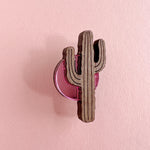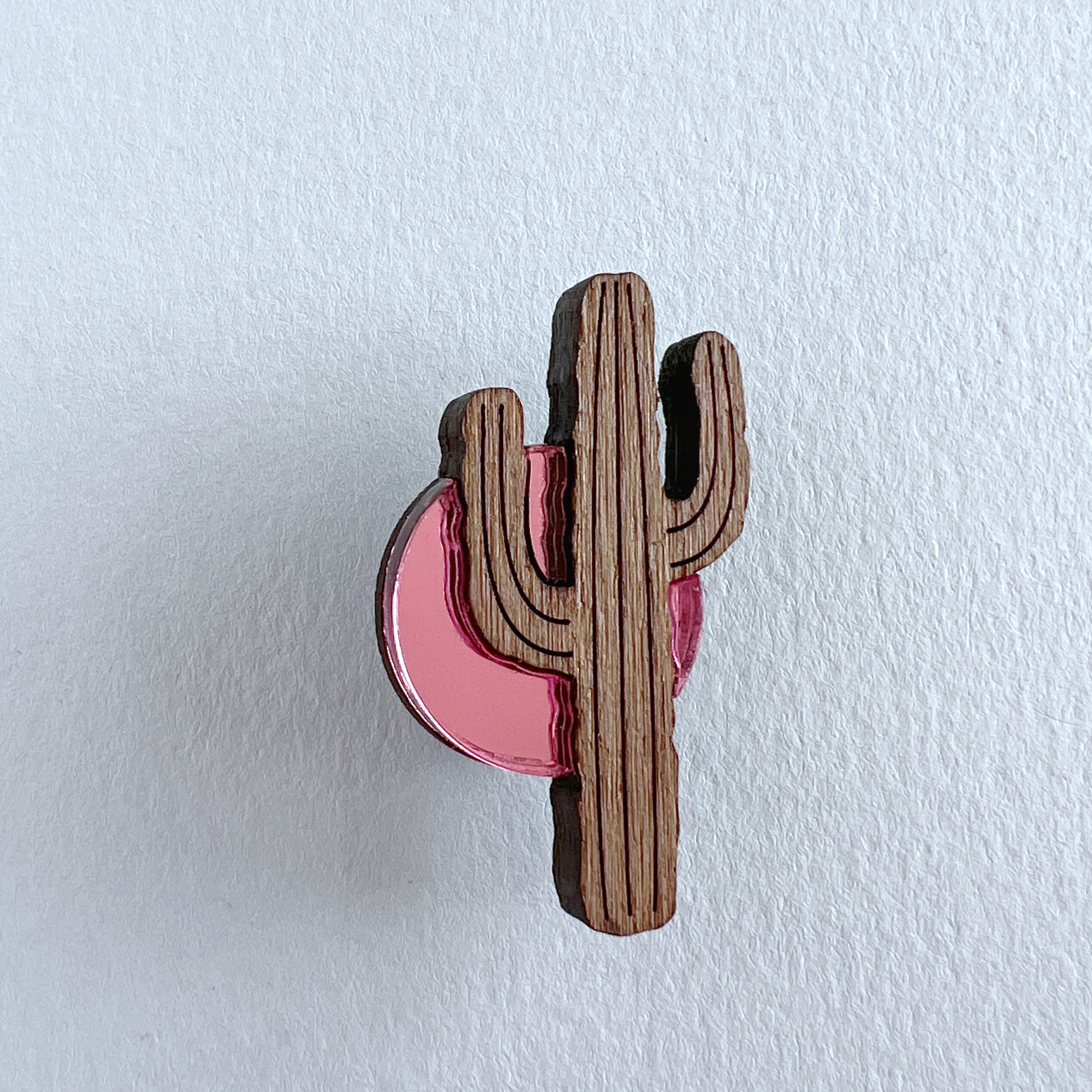 Stylish cactus pin in etched walnut and pink mirror sun setting behind. Absolutely gorgeous on your fave denim shirt to dial up the western flair.