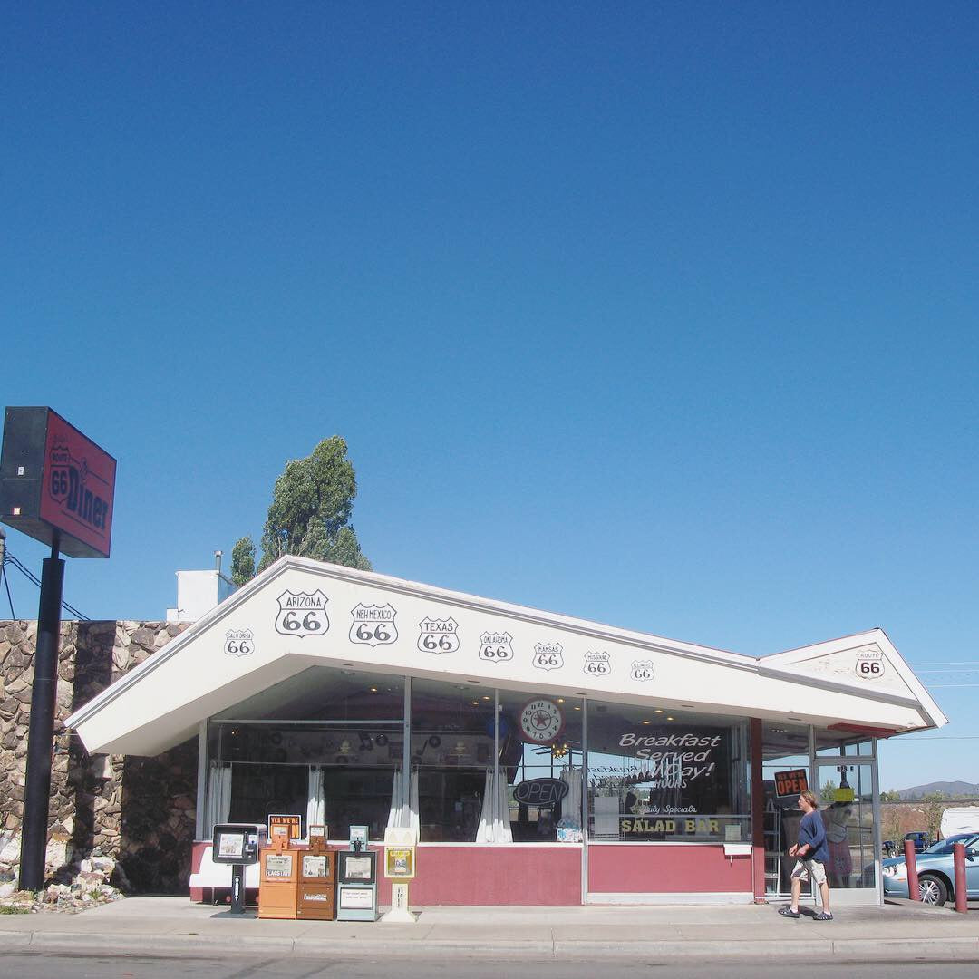 This design is based on a Route 66 cafe in Williams, Arizona we stopped at on route to the Grand Canyon, which had this lovely Googie-style roof-line.