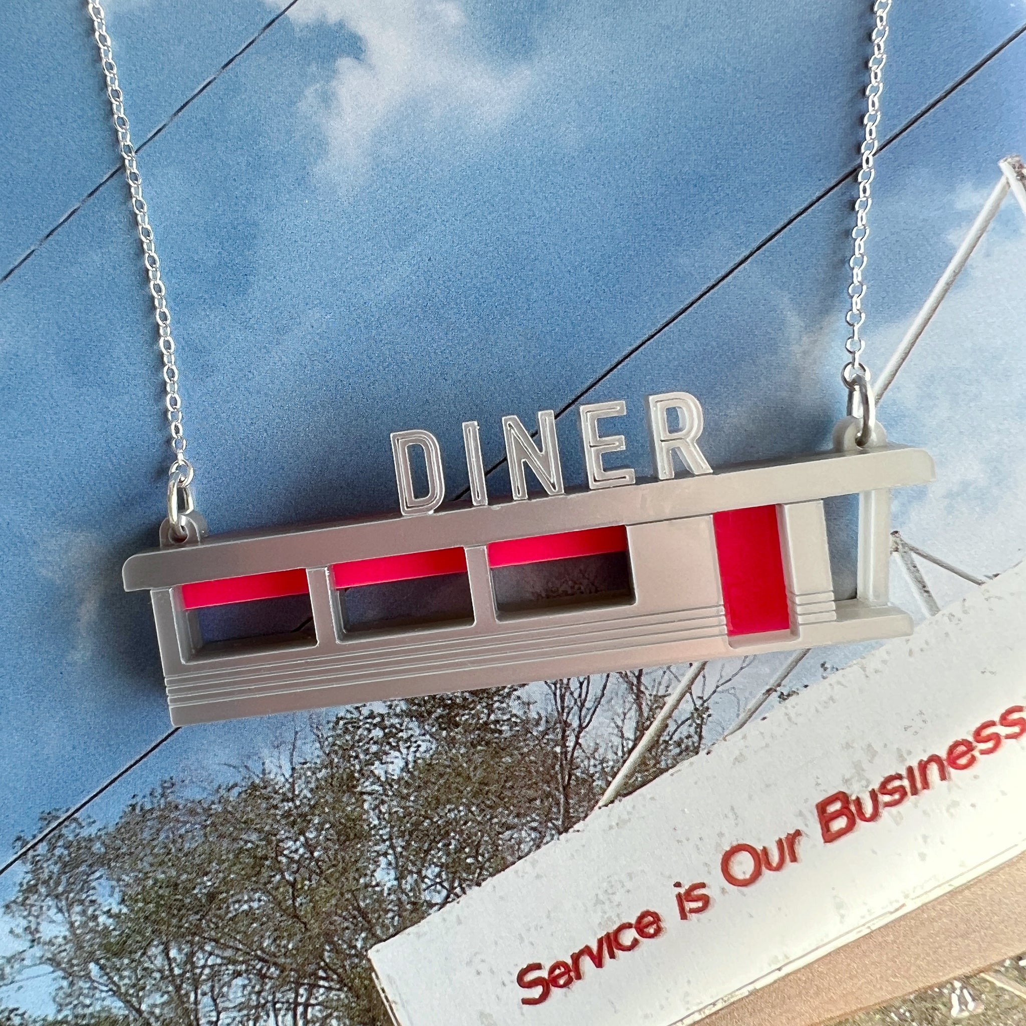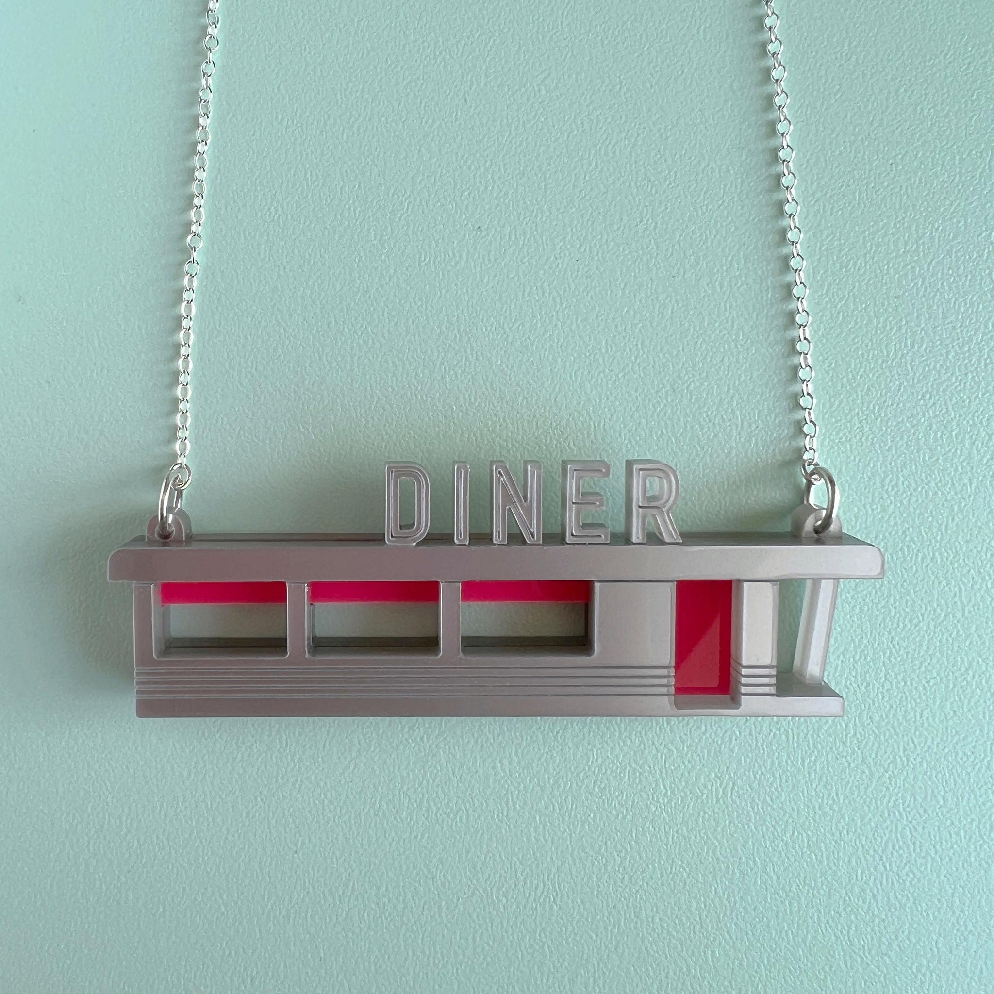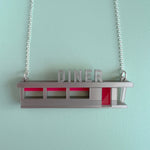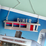 Made from two layers of glossy silver acrylic, that catches the light as it moves. The diner's entrance and window blinds are a hot neon pink –which really pops against the silver – and the subtle etched lines and that classic DINER lettering completes the nostalgia hit.