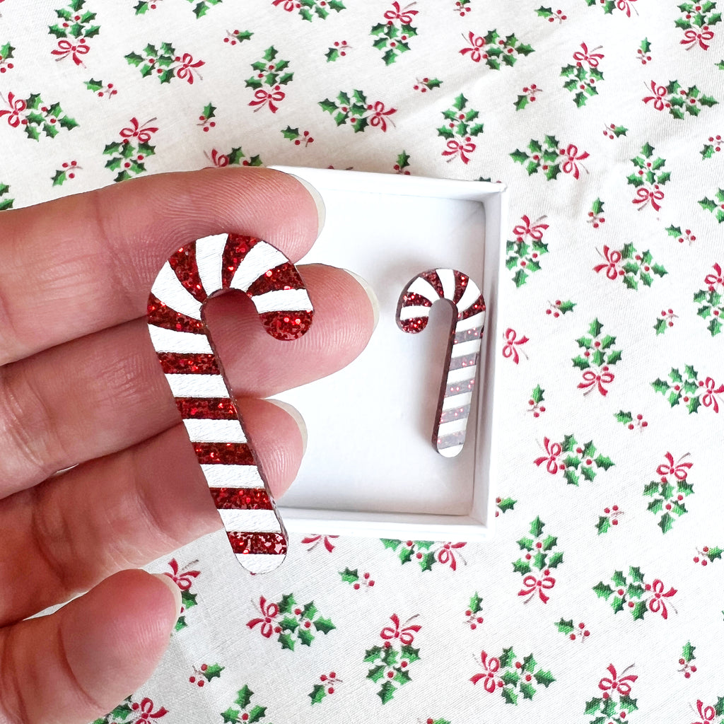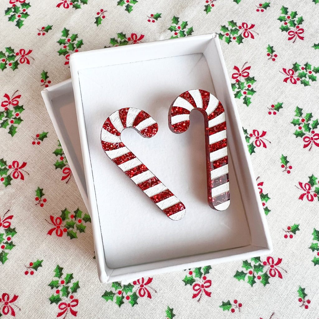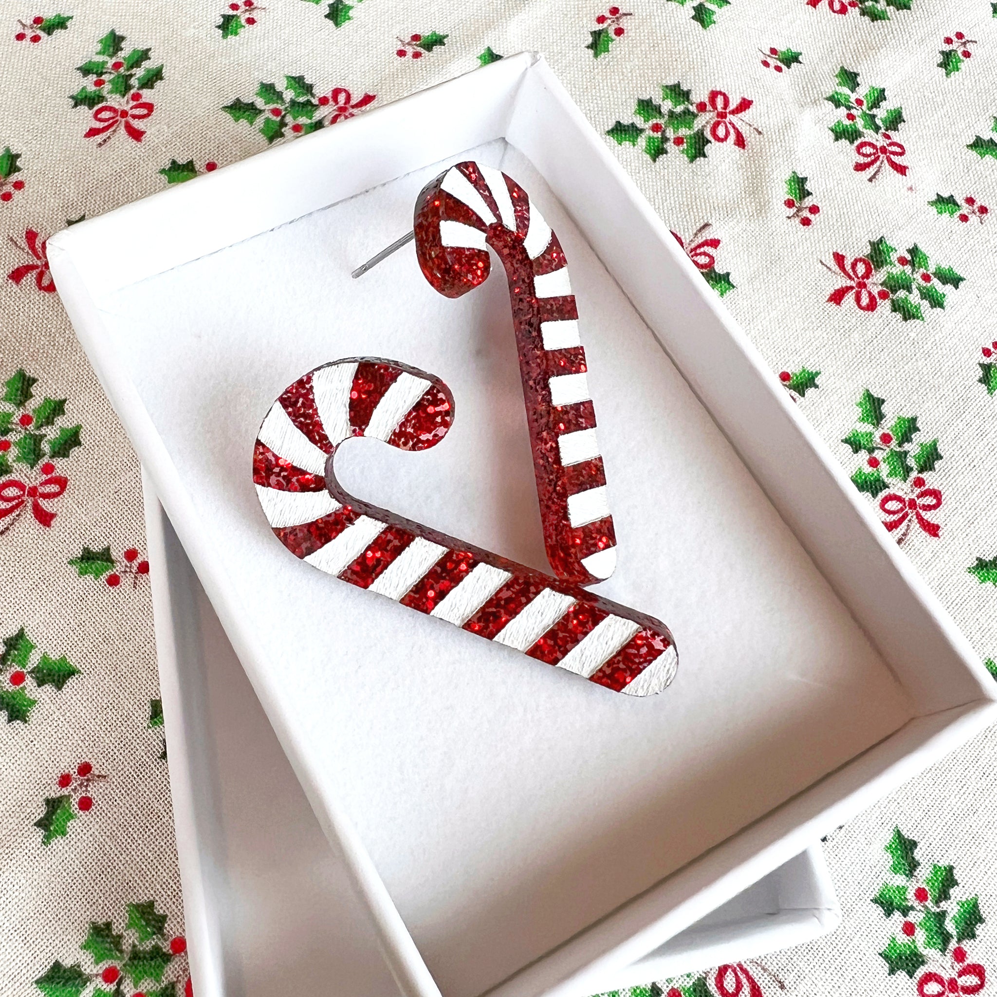 Made from red glitter Perspex, with etched painted stripes. They're a perfect match with our Christmas Restaurant necklace (available separately) - which features a candy cane on the roof.