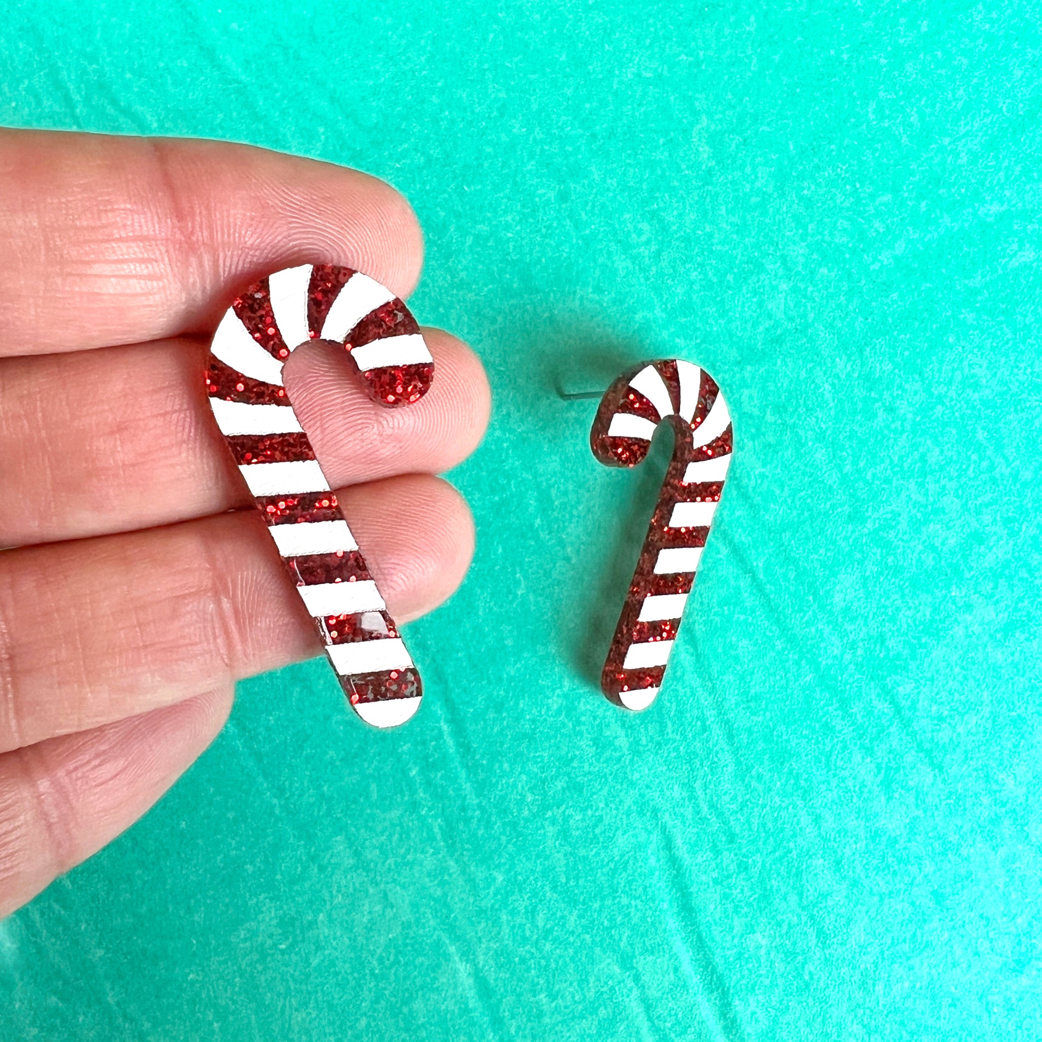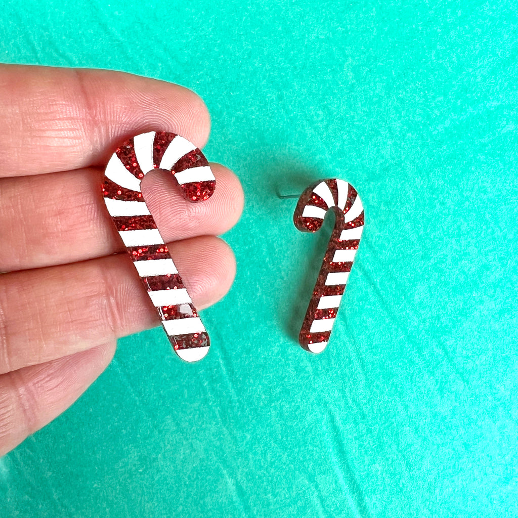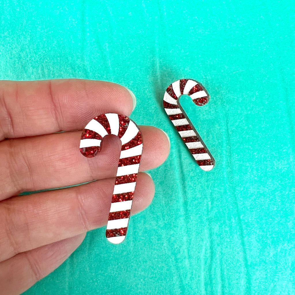 Made from red glitter Perspex, with etched painted stripes. They're a perfect match with our Christmas Restaurant necklace (available separately) - which features a candy cane on the roof.