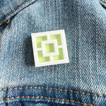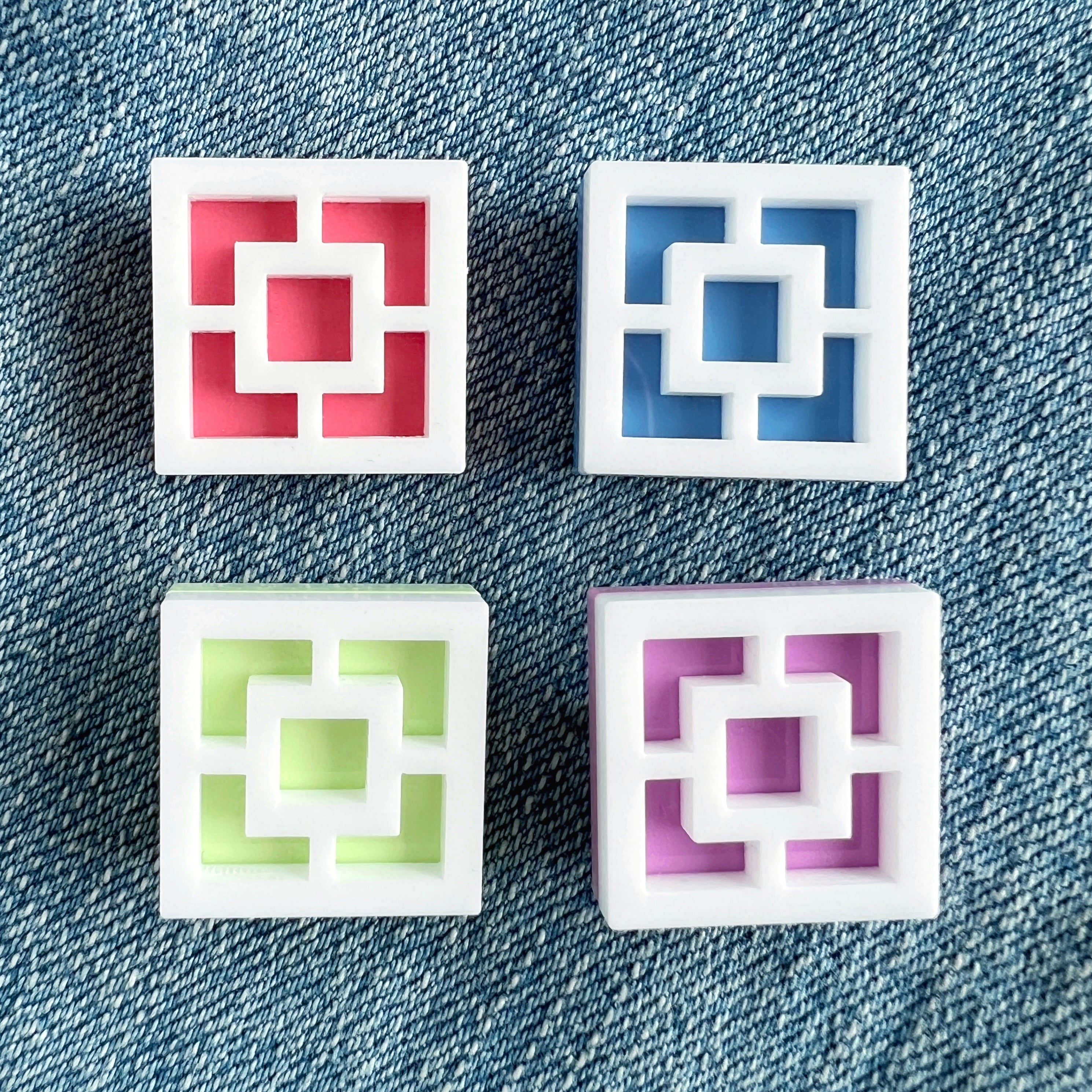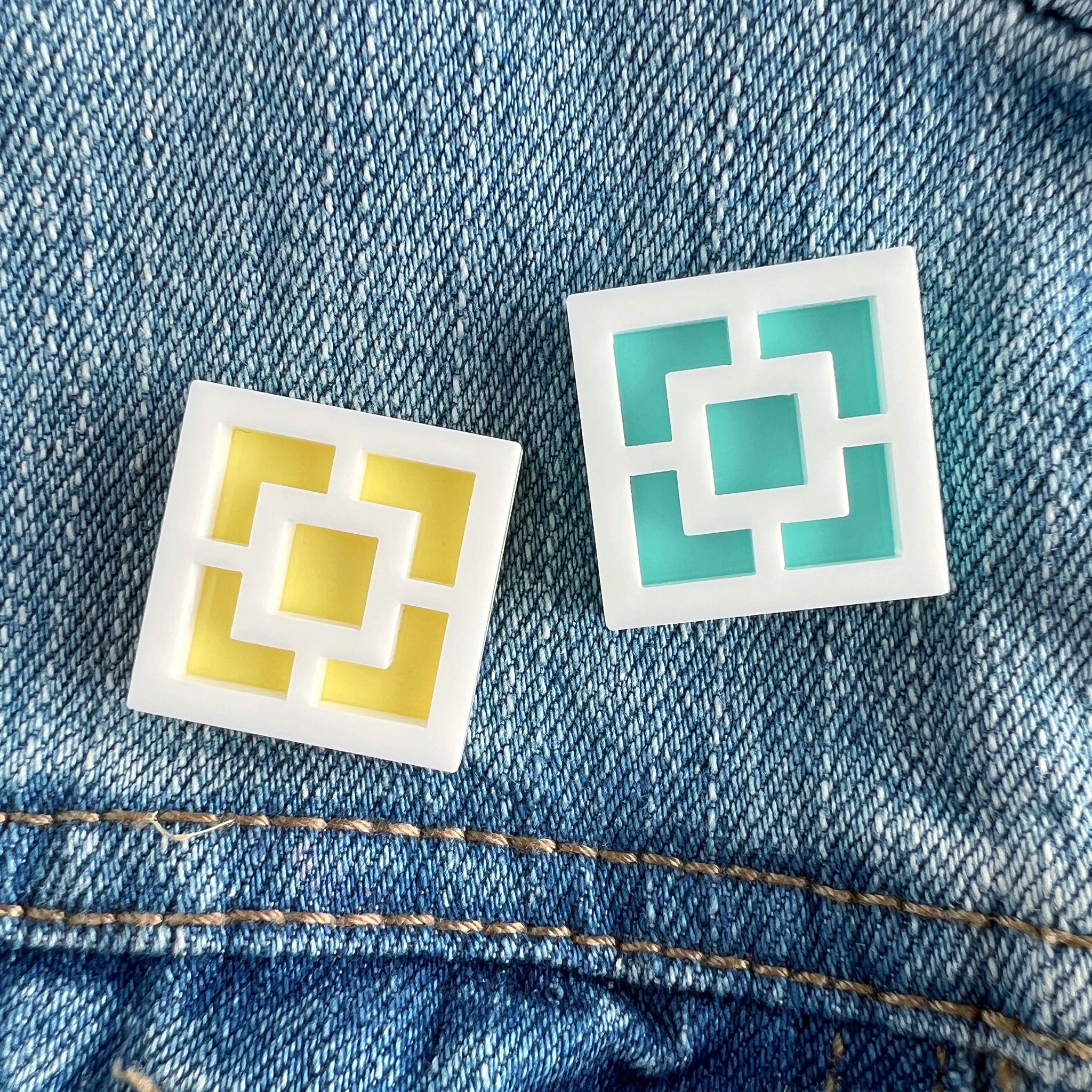 This eye-catching pin is a stylish way to add a pop of playful nostalgic charm to your everyday outfits. Crafted with two layers of acrylic the square breeze block design has a timeless style and the colour options perfectly capture sunny Palm Springs modernism.