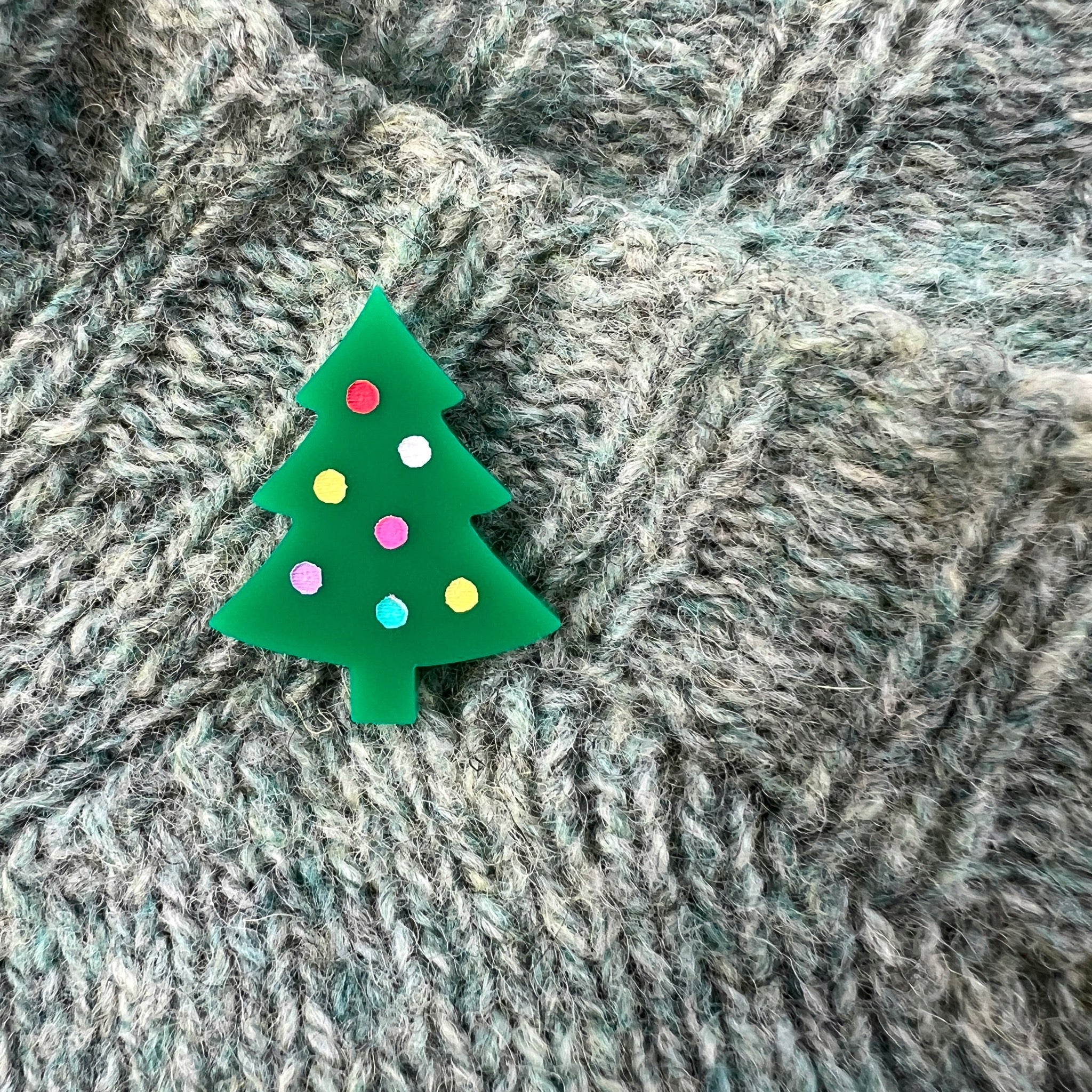 Laser cut in our home studio from bright green acrylic, with etched, hand-painted baubles. Backed with a clutch-pin to attach to clothing (not recommended for use on delicate or fine fabrics).