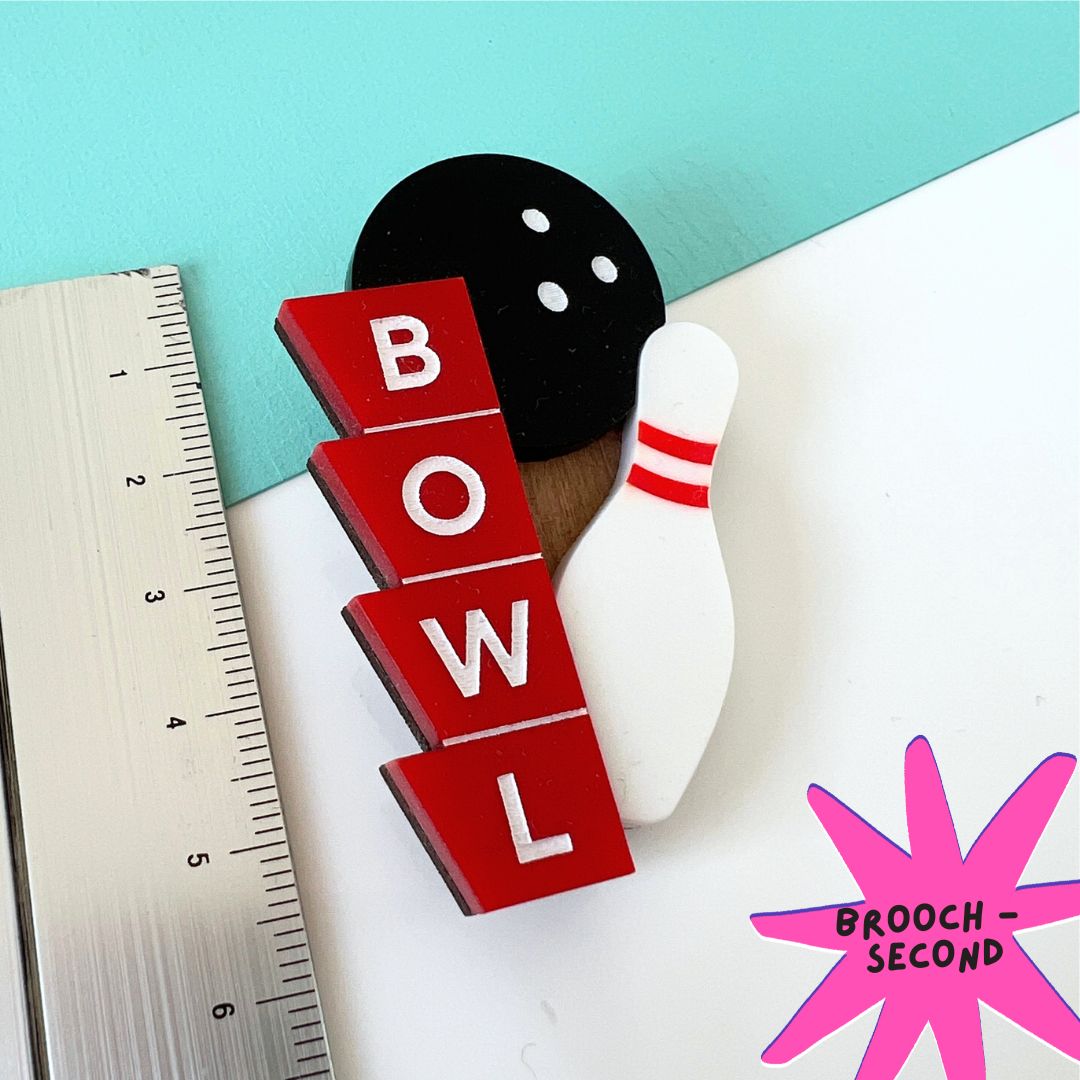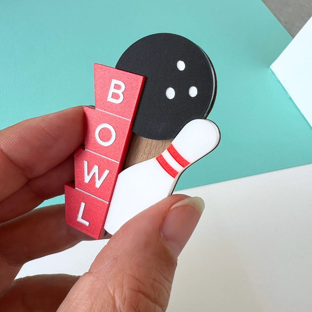 Retro bowling Sign necklace with etched painted details and walnut back.