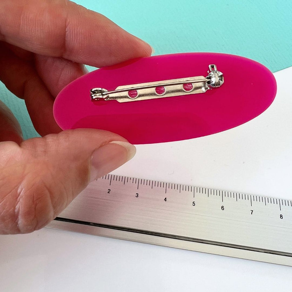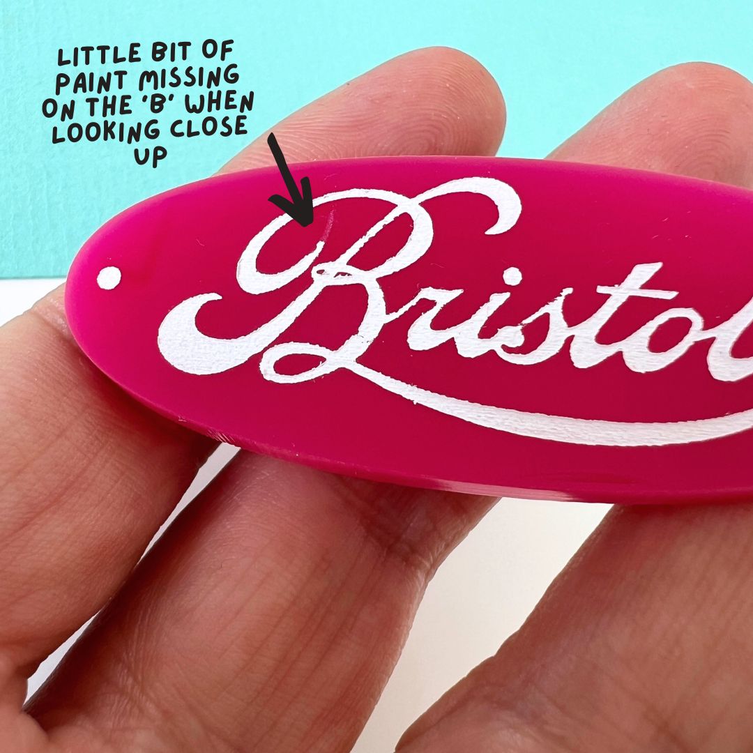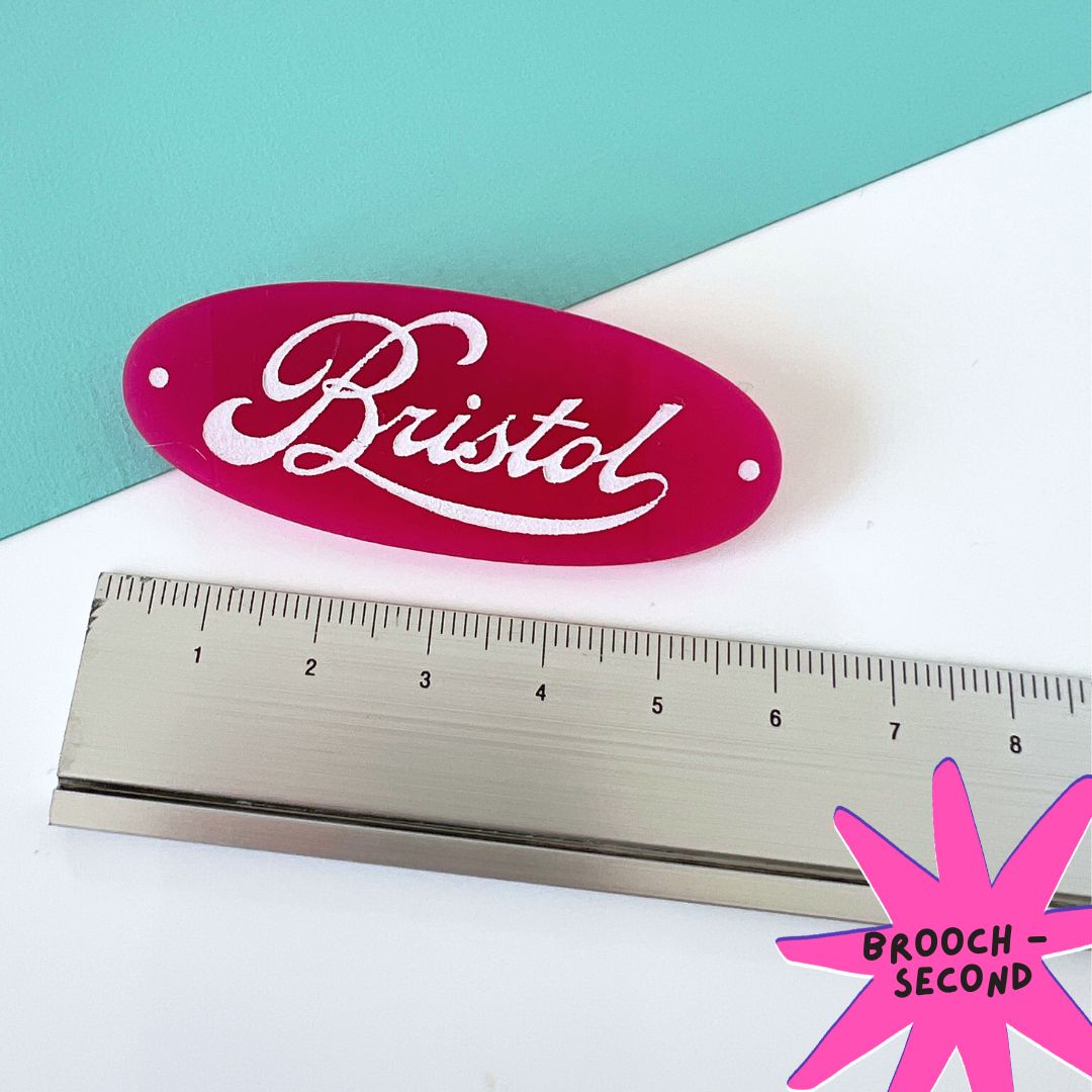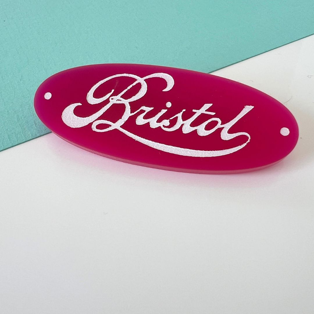 Pink acrylic brooch with white painted 'Bristol' wording in the classic Bristol Motors car font.