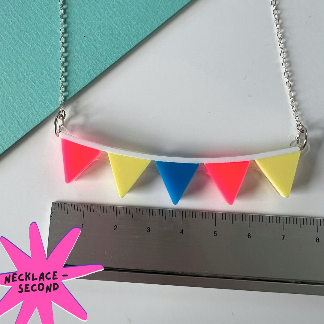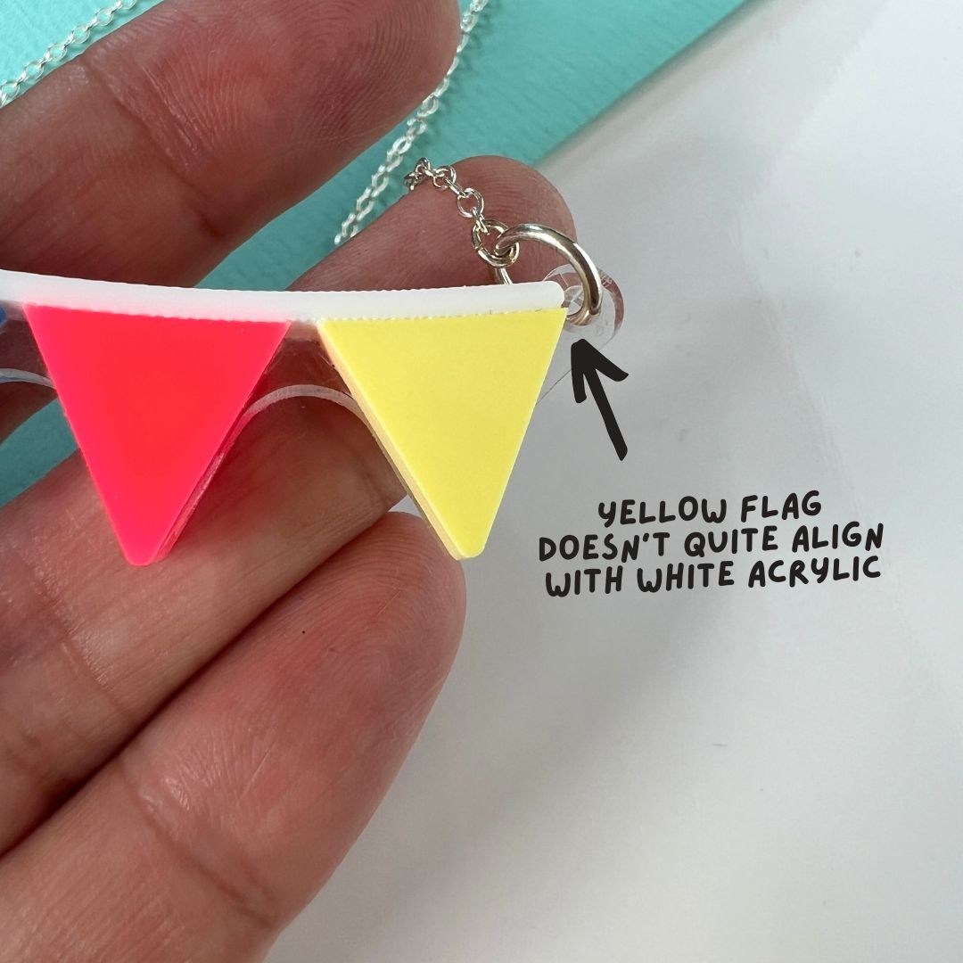 Bunting necklace made from clear, white, hot pink, yellow and blue Perspex.