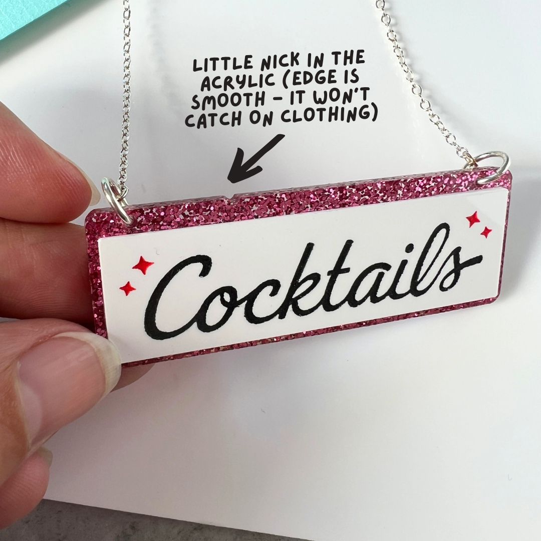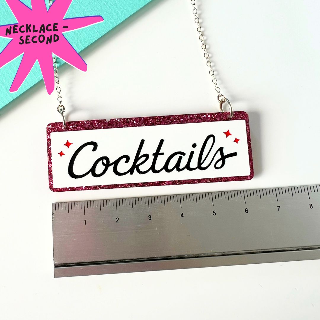 Pink glitter and white 'Cocktails' sign necklace with etched, painted wording.