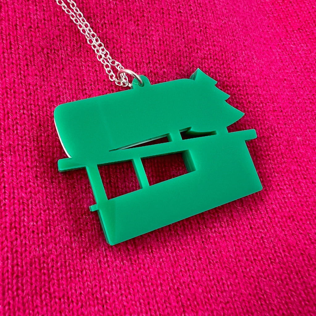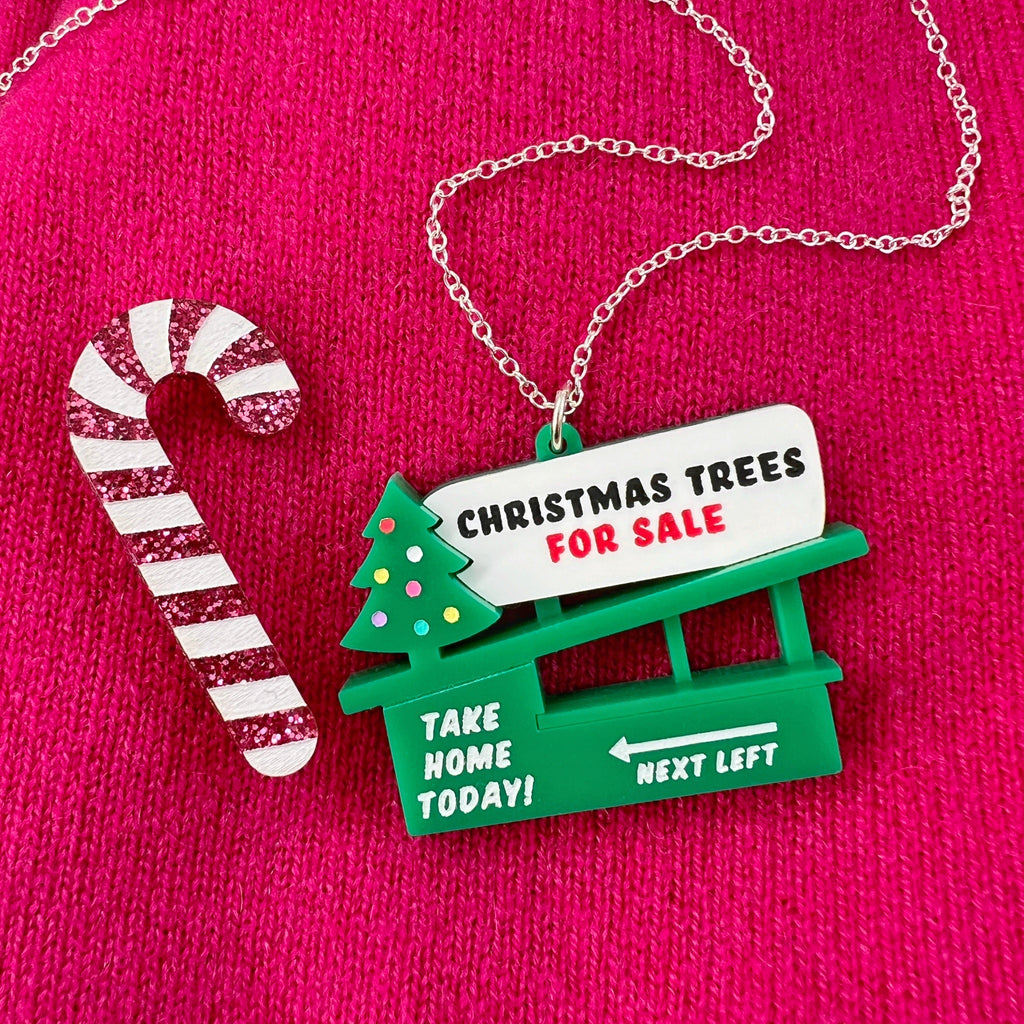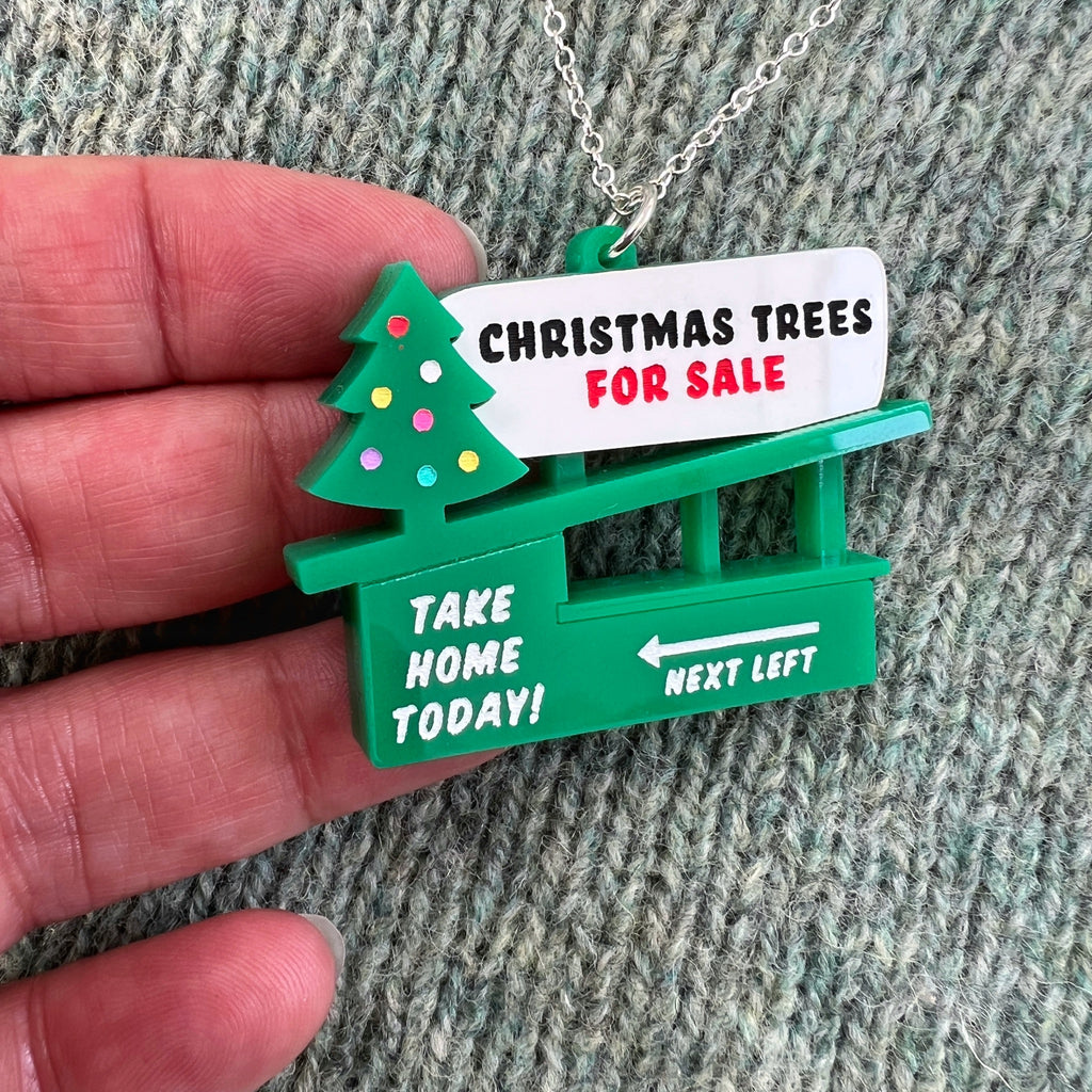 Our best-selling Christmas necklace is back! Inspired by pop-up roadside Christmas tree sale sites, this cute kiosk necklace is laser cut from festive green Perspex on a white base – with white, black and red hand-painted wording.