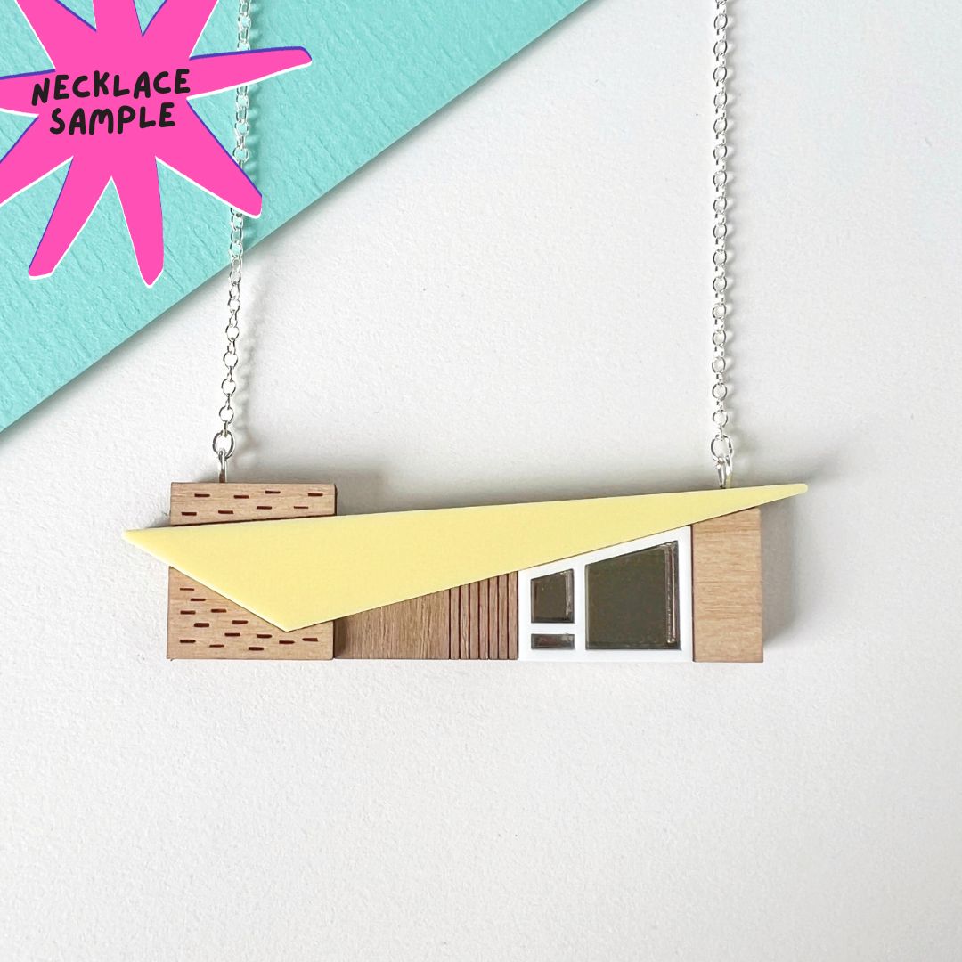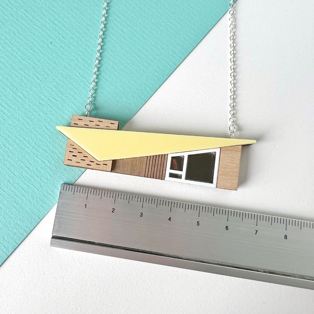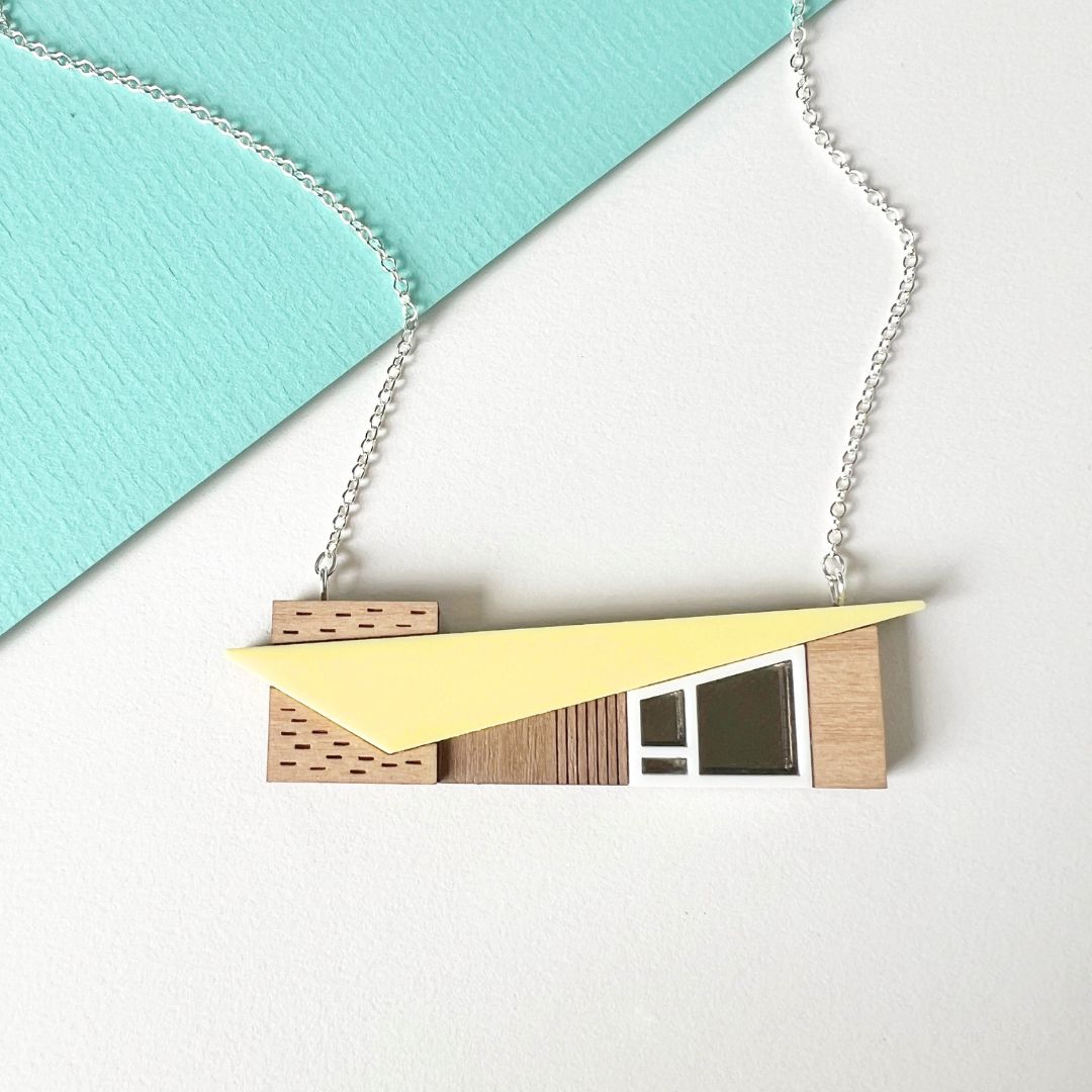 Statement roof house necklace in wood and yellow acrylic.