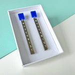 Cobalt blue acrylic studs, bronze mirrored acrylic drops with etched wording inked in white.