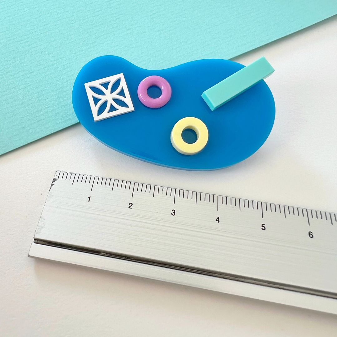 Laser cut acrylic in blue, pink, yellow, mint and white.