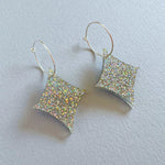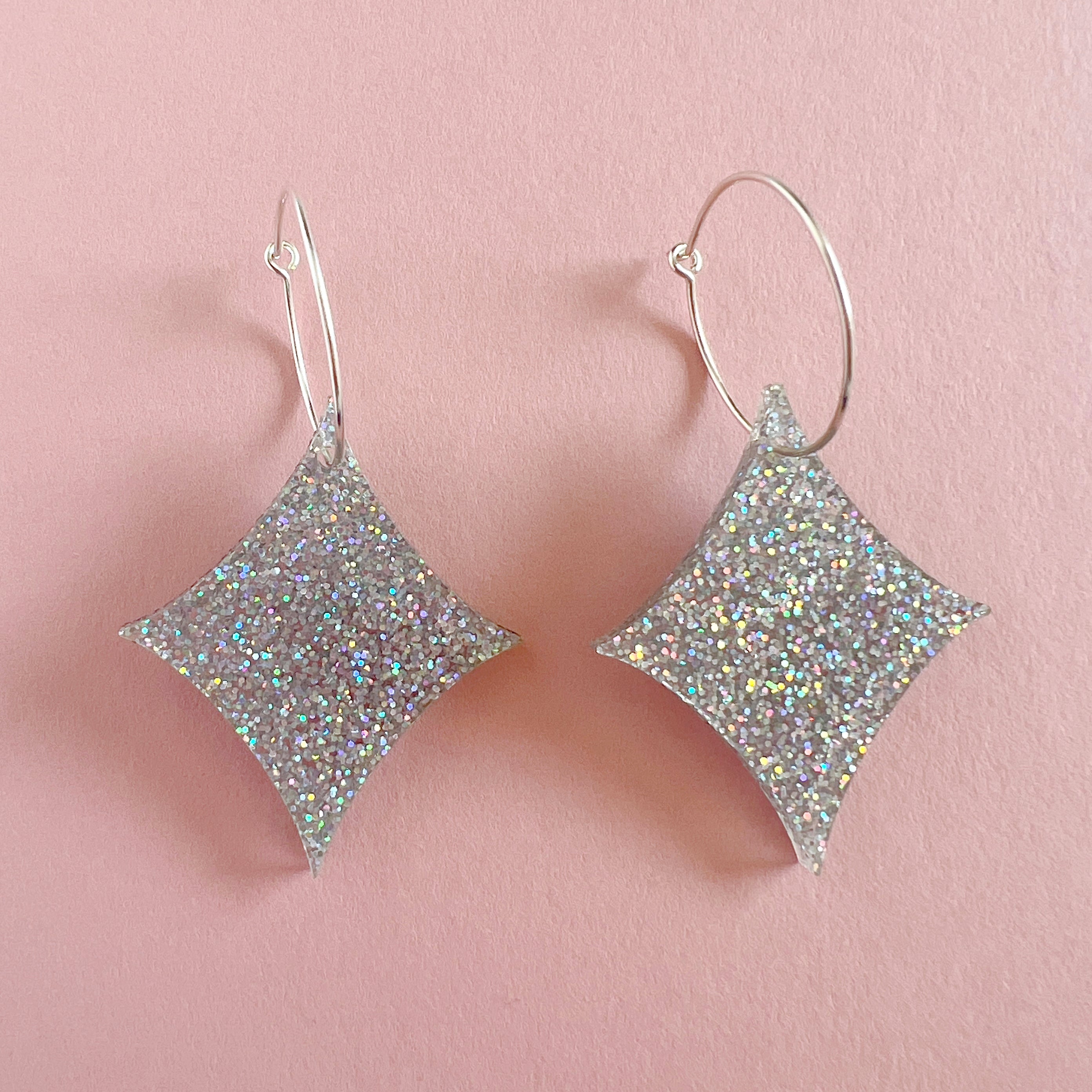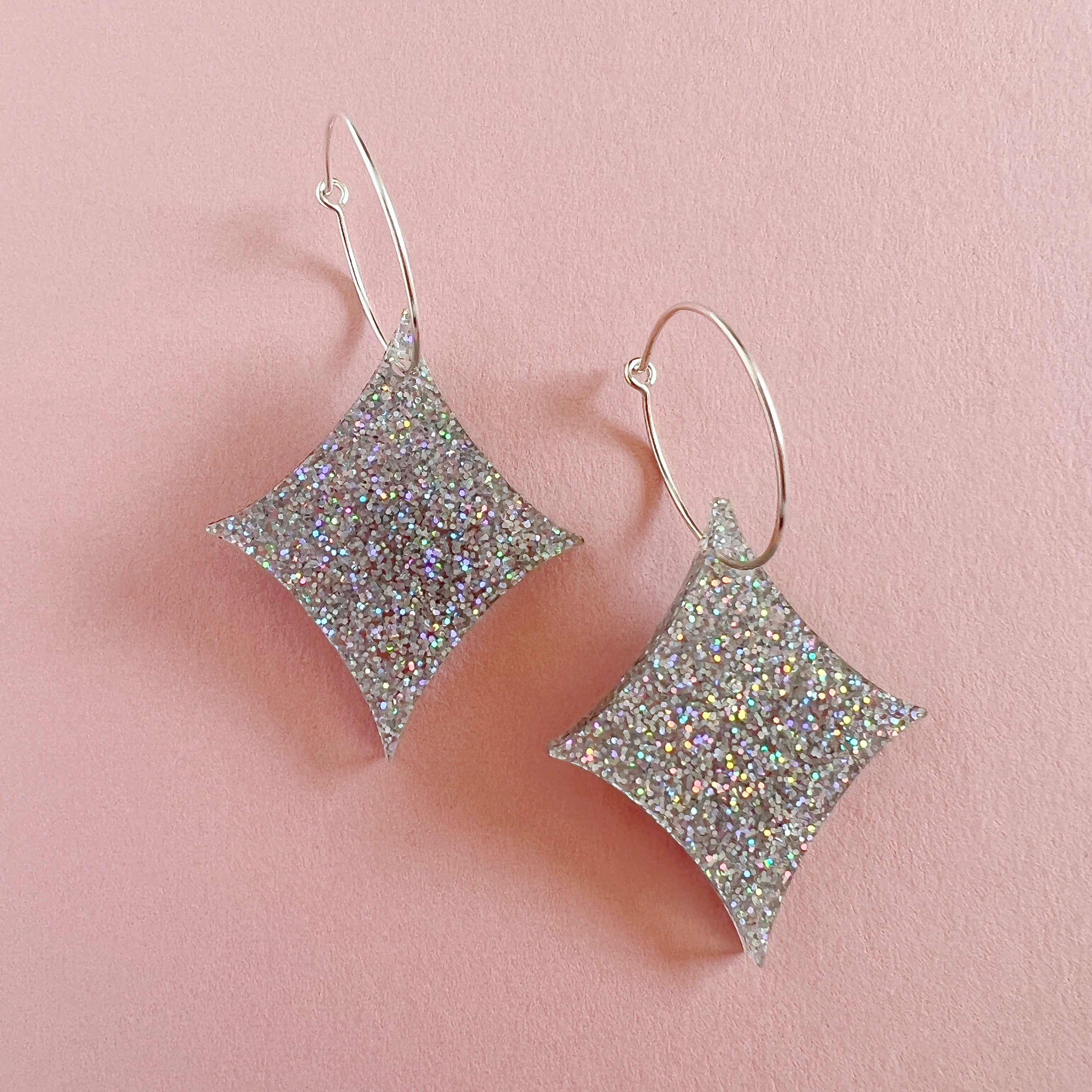 Glittery acrylic dangle earrings on delicate sterling silver hoops, inspired by the classic and timeless 'starburst' shapes seen in midcentury signs and graphics.