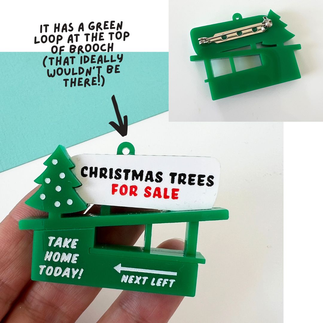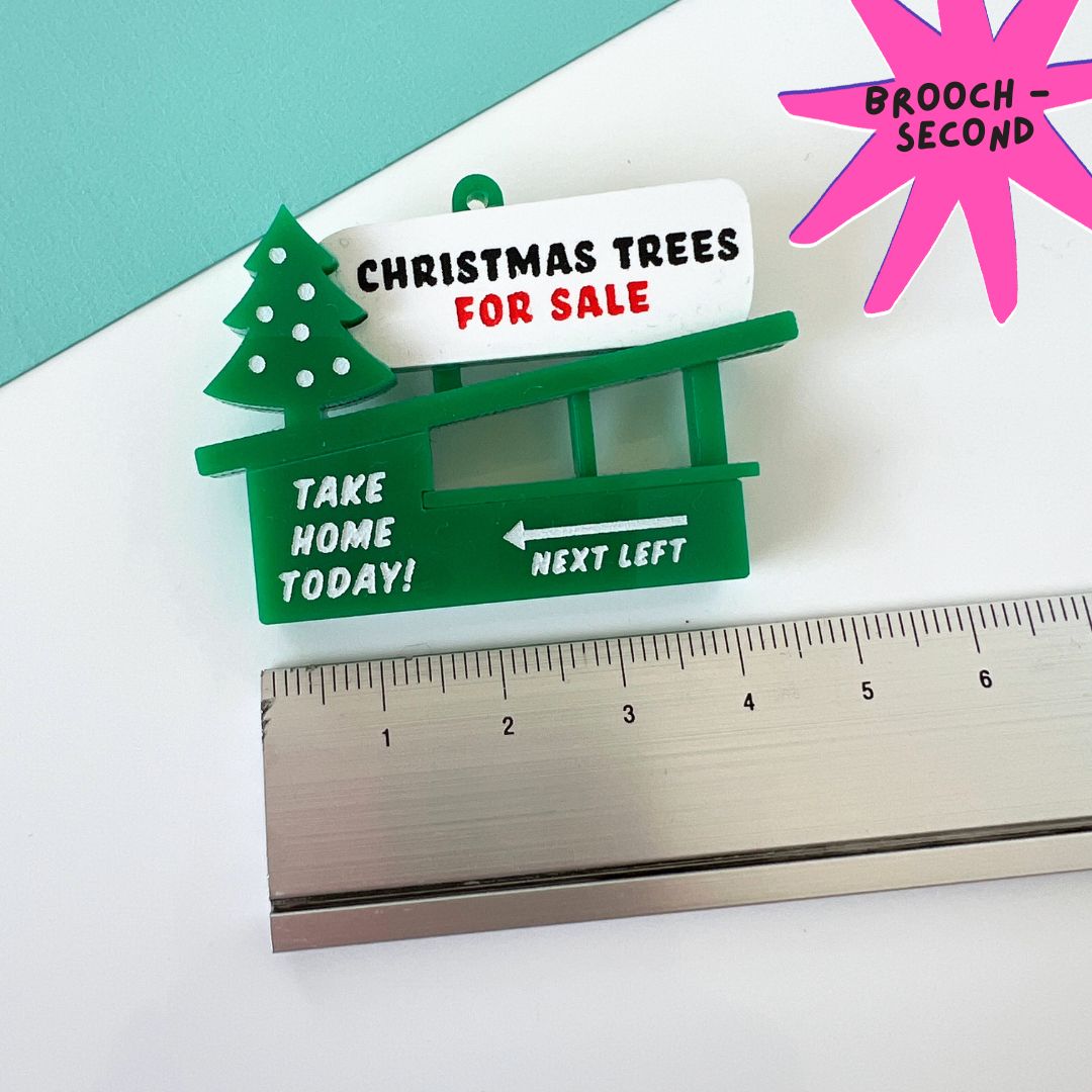 'Christmas Trees for sale' brooch in green and white acrylic with etched hand-painted wording.